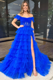 A-line Off the Shoulder Blue Ruffle Tulle evening gowns Long Prom Dress with Slit