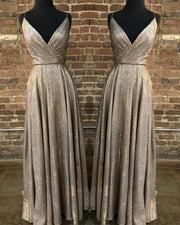 A-line Pleated V Neck Split Glitter Prom Dresses