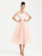 A-Line Prom Dresses Elegant Dress Wedding Guest Cocktail Party Tea Length Short Sleeve V Neck Tulle with Appliques