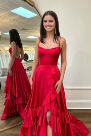A-Line Scoop Neck Ruffle Satin Red Long Prom Dresses with Slit