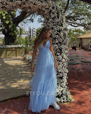 A Line Simple V-Neck Light Blue Tulle Long formal dresses Bridesmaid Dresses evening gown Prom Dress
