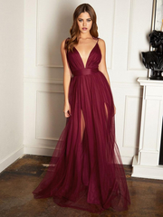 A-Line Sleeveless Floor-Length Tulle formal dresses evening gown Split Front Bridesmaid Dresses