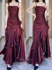 A-line Spaghetti Straps Wine Red Satin formal dresses Bridesmaid Dresses evening gown Prom Dress