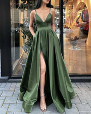 A Line Split V Satin Neck Prom Dresses With Pockets