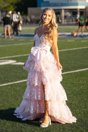 A Line V Neck Blush Pink Sequins Tiered formal dress evening gown Long Prom Dresses with Bow