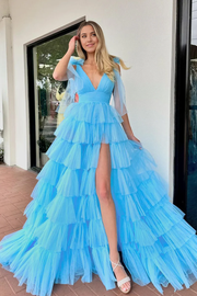 A-Line V Neck Ruffle Tiered Tulle Blue Long Prom Dress with Slit