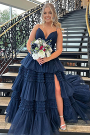 A Line V Neck Ruffle Tiered Tulle evening gowns Prom Dress with Slit