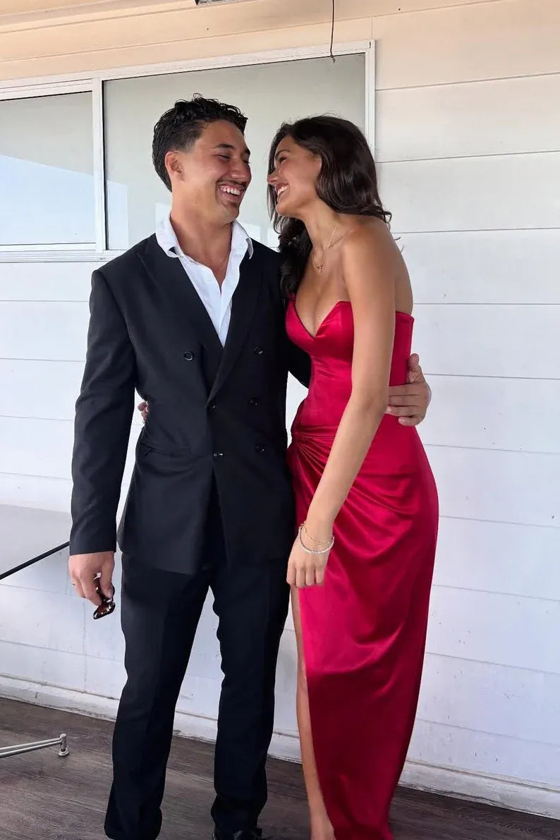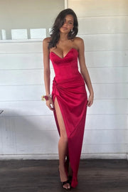 This red satin strapless gown features a sweetheart deep V-neck bodice, ruched side detailing, and a dramatic high thigh slit (paired with a floor-length flowing hem). The vivid red tone and lustrous satin texture balance modern allure with elegant sophistication, making it ideal for cocktail parties, evening galas, or upscale date nights—combines figure-hugging tailoring with polished, eye-catching charm.