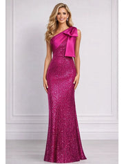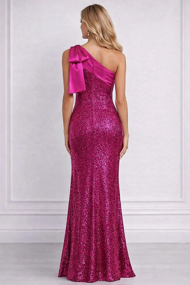 Glamorous one-shoulder mermaid maxi prom dress is crafted from shimmering fuchsia sequins, featuring a smooth satin bodice panel with a large decorative bow at the shoulder. The form-fitting silhouette hugs the figure before flaring into a floor-length silhouette. The back showcases a sleek one-shoulder design with a zipper closure for a tailored fit. Ideal for prom nights, formal galas, and evening events, this gown exudes sparkling elegance and bold allure.