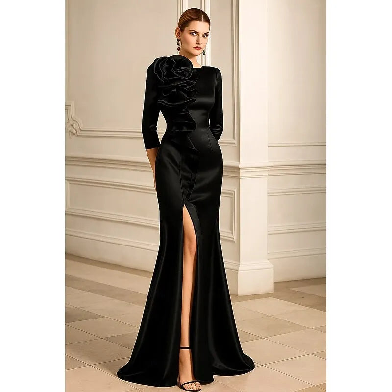 Glamorous 3/4-sleeve mermaid maxi dress is crafted from lustrous fuchsia satin, featuring a round neckline with a large 3D rose appliqué and cascading ruffle detail on the shoulder. The form-fitting silhouette hugs the figure before flaring into a floor-length silhouette with a high front slit. The back showcases a sleek design with a zipper closure for a tailored fit. Ideal for formal galas, wedding receptions, and evening events, this gown exudes opulent elegance and romantic allure.