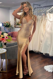 Mermaid Long Beaded Sexy Sparkly Gold Prom Dress With Split