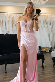 Mermaid Off The Shoulder Lace Top Long Sequin Pink evening gown Prom Dress With High Slit
