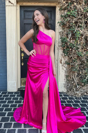 Mermaid One Shoulder Pink Silk Satin Long Prom Dresses with Slit