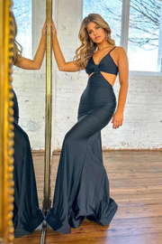 Mermaid Sexy V Neck Cutouts Black Satin Long Prom Dress