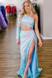 Mermaid Sparkly One Shoulder Light Blue Sequins Long Prom Dresses with Slit