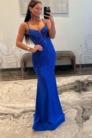 Mermaid Sparkly V Neck Royal Blue Long Prom Dresses with Beading