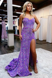 Mermaid Sweetheart Cute Light Purple Sequins Long Prom Dresses with Slit