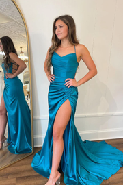 Mermaid Sweetheart Cute Peacock Blue Silk Satin Long Prom Dress with Slit - US 2 / UK 6 / EU 32