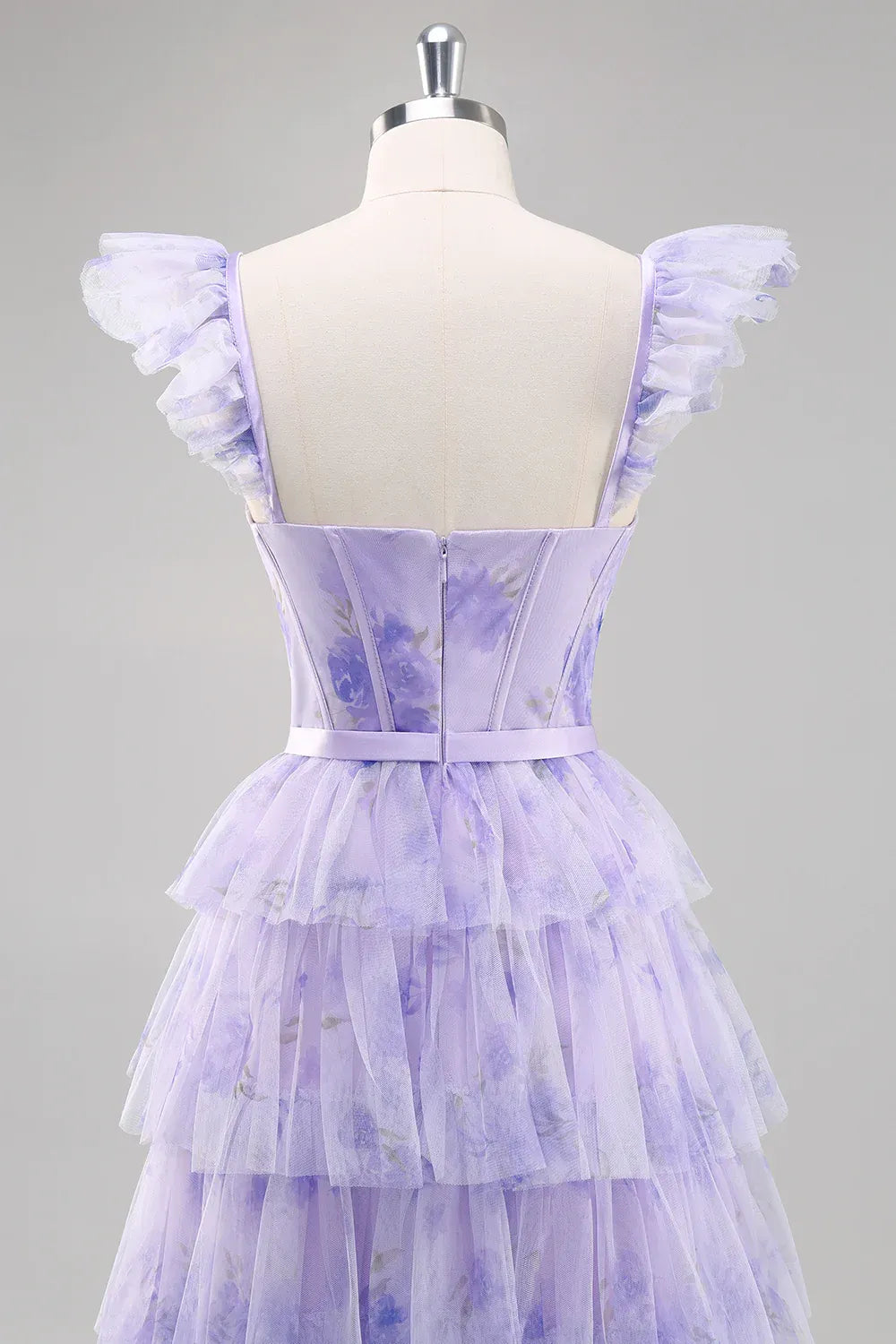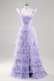 Romantic sweetheart-neck ball gown prom dress is crafted from airy lavender tulle, printed with delicate floral patterns. The corset-style bodice features ruffled shoulder straps and a satin waistband, while the skirt cascades into multiple ruffle layers with a high front slit, flowing into a sweeping train. The back showcases a matching corset design with a zipper closure for a tailored fit. Ideal for fairy-tale proms, garden weddings, and lavender-themed events, this gown exudes ethereal romance and whimsical allure.