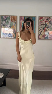 Sheath Long Ruffle Light Yellow Satin formal dresses Bridesmaid Dresses evening gown Prom Dress