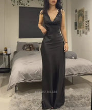 Sheath V-Neck Black Satin formal dresses Bridesmaid Dresses evening gown Prom Dress