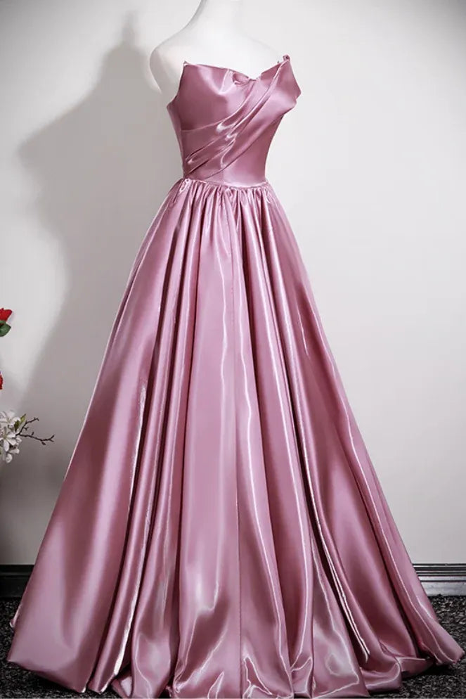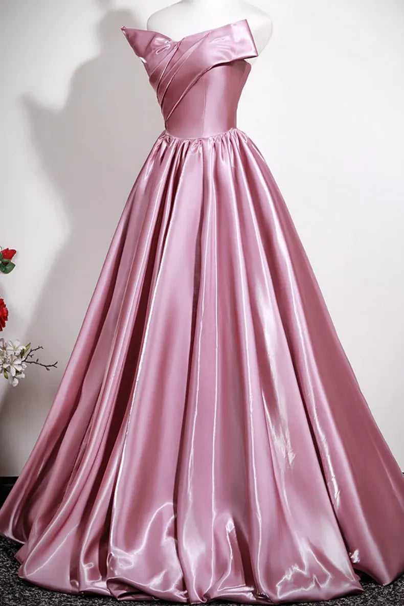 This dusty rose satin ballgown features an off-shoulder draped bodice, a corset-style lace-up back (adorned with an oversized satin bow), and a voluminous A-line floor-length skirt. The lustrous satin texture and soft dusty rose tone balance romantic elegance with regal glamour, making it ideal for prom events, formal galas, or wedding receptions—combines flowing tailoring with polished, whimsical allure.