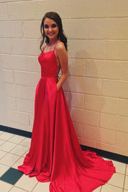 Simple A-Line Spaghetti Strap Sleeveless Lace Up Chapel Train Prom Dress - US 2 / UK 6 / EU 32