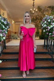 This fuchsia satin maxi dress features an off-shoulder neckline (adorned with an oversized front bow), a corset-style back, and a flowing A-line midi-length skirt. The lustrous satin texture and bold fuchsia tone balance playful glamour with sophisticated elegance, making it ideal for upscale cocktail events, formal dinner parties, or wedding receptions—combines striking tailoring with eye-catching, polished allure.