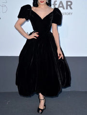 A-Line Cocktail Dresses Elegant Dress Formal Halloween Tea Length Short Sleeve V Neck Fall Wedding Guest Velvet with Ruffles - US 2 / UK 6 / EU 32