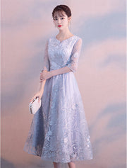 A-Line Elegant Cocktail Party Prom Dress Jewel Neck 3/4 Length Sleeve Tea Length Lace with Lace Insert Pattern / Print Appliques - US 2 / UK 6 / EU 32