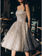 A-Line Prom Dresses Glittering Dress Party Wear Engagement Knee Length Sleeveless Strapless Sequined with Pleats Sequin