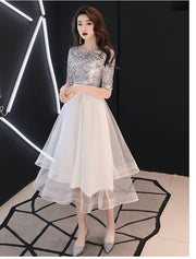 A-Line Sparkle White Cocktail Party Prom Dress Jewel Neck Half Sleeve Tea Length Satin with Sequin Tier - US 2 / UK 6 / EU 32