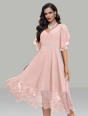 A-Line Wedding Guest Dresses Elegant Dress Cocktail Party Tea Length Short Sleeve V Neck Belt / Sash Chiffon with Rhinestone Glitter Embroidery