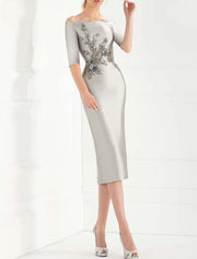 Sheath / Column Cocktail Dresses Elegant Dress Party Wear Wedding Party Tea Length Half Sleeve Off Shoulder Capes Taffeta with Appliques