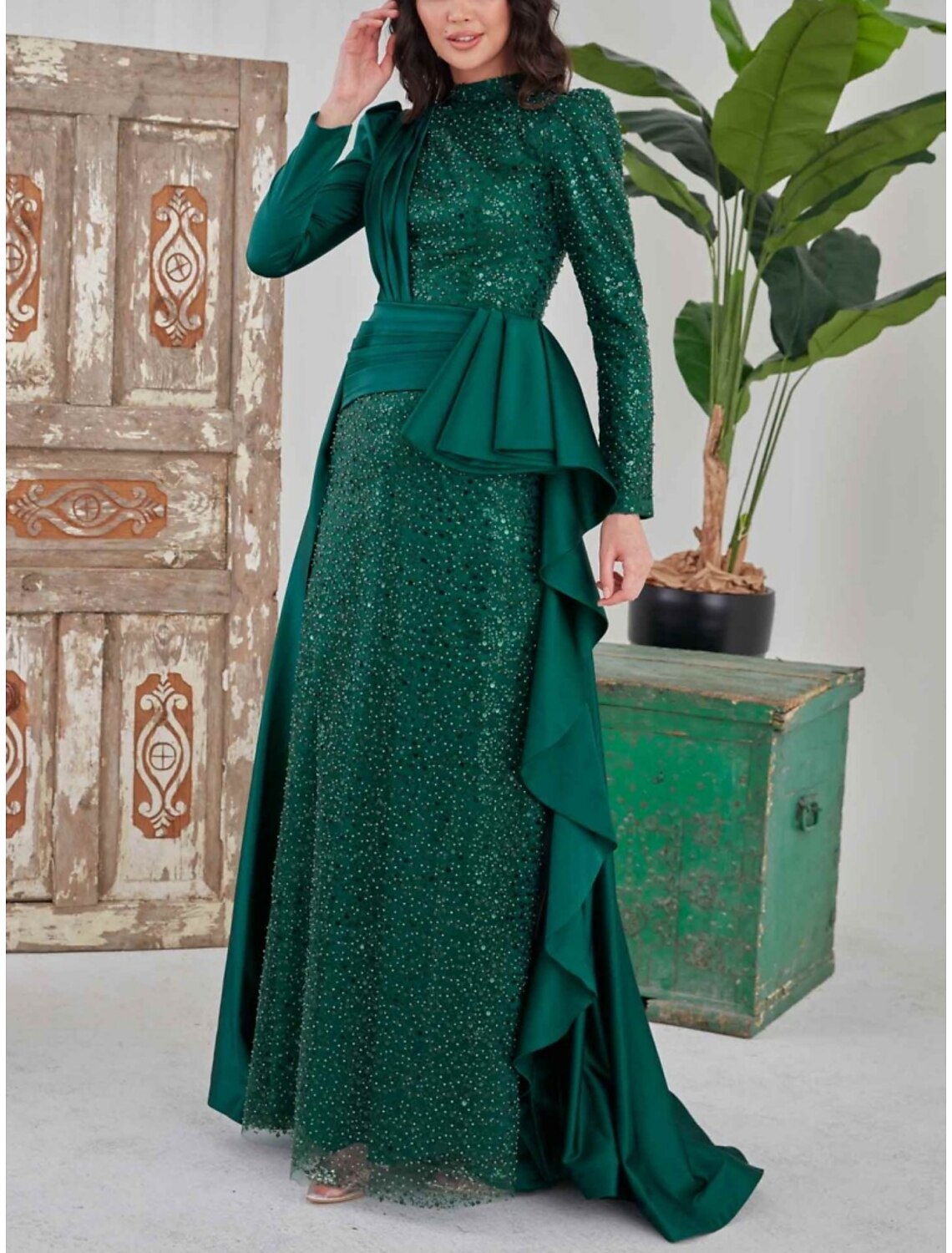 A-Line Evening Gown Champagne Elegant Dress Formal Sweep / Brush Train Long Sleeve High Neck Satin with Glitter Pleats Ruched