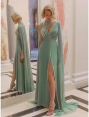A-Line Evening Gown Elegant Dress Formal Court Train Sleeveless V Neck Sequined with Glitter Pleats