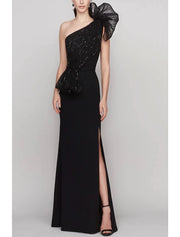 A-Line Evening Gown Elegant Dress Formal Evening Party Floor Length Sleeveless One Shoulder Stretch Fabric with Glitter Shouder Flower