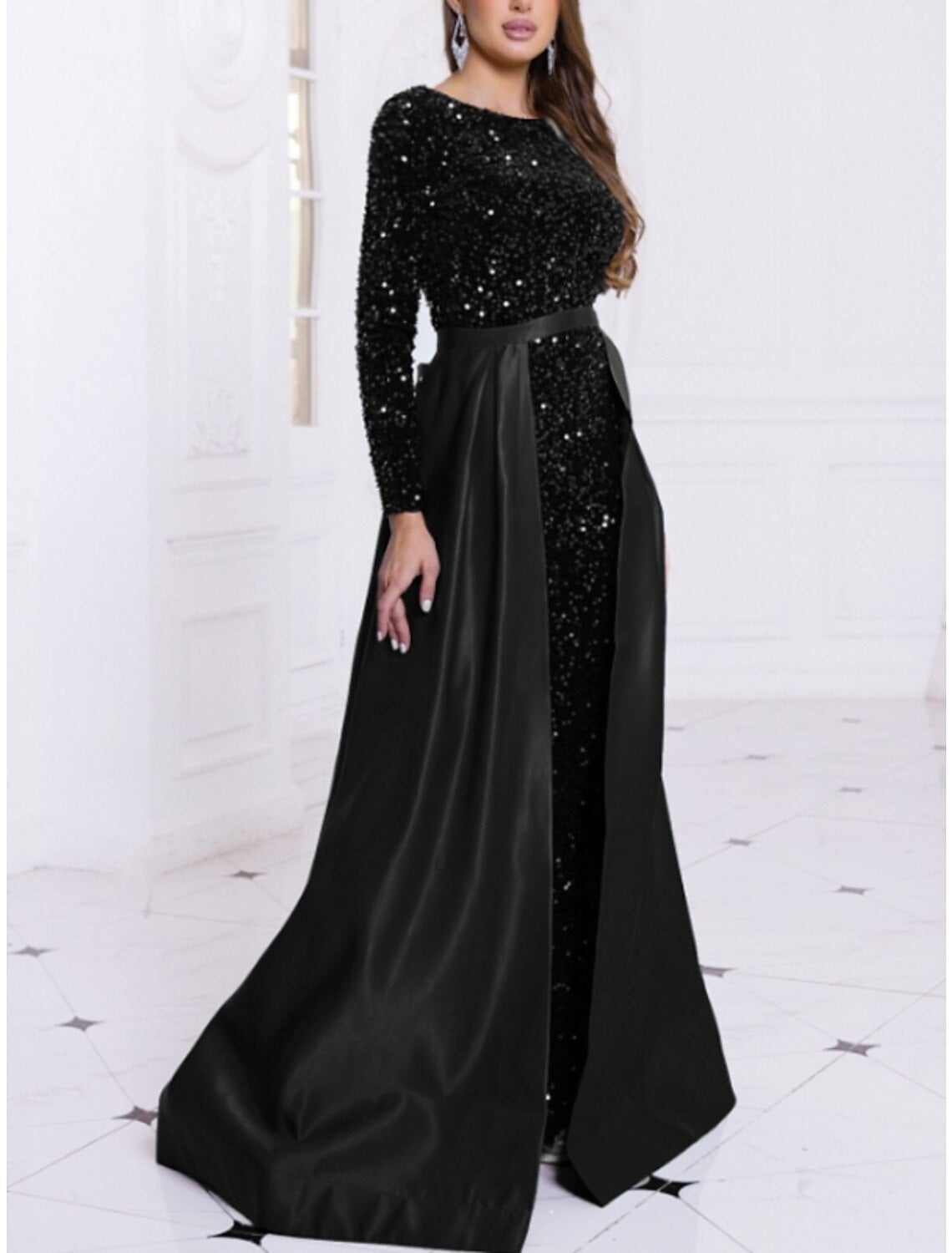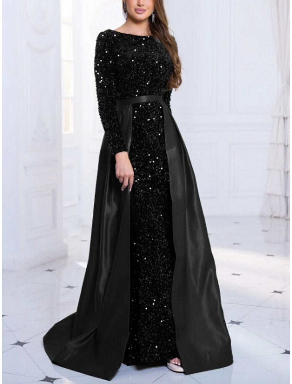 A-Line Evening Gown Elegant Dress Formal Fall Sweep / Brush Train Long Sleeve Jewel Neck Sequined with Glitter Pleats