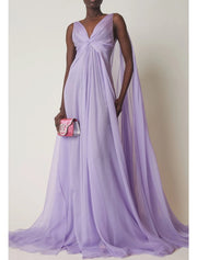 A-Line Evening Gown Elegant Dress Formal Wedding Guest Sweep / Brush Train Sleeveless V Neck Capes Chiffon with Ruched
