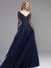 A-Line Evening Gown Open Back Dress Formal Evening Sweep / Brush Train Long Sleeve Plunging Neck Chiffon with Appliques