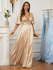 A-Line/Princess Silk like Satin Ruched V-neck Short Sleeves Floor-Length Dresses