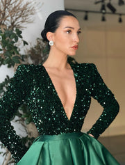 Ball Gown Evening Black Dress Plus Size Sparkle Dress Wedding Party Birthday Floor Length Long Sleeve V Neck Pocket Satin with Sequin Pocket - Dark Green