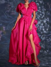 Ball Gown Evening Gown Puffy Dress Formal Wedding Guest Floor Length Sleeveless V Neck Tulle with Bow(s) Slit