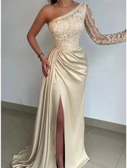 Mermaid Black Dress Evening Gown Hot Dress Formal Wedding Party Sweep / Brush Train Long Sleeve One Shoulder Bridesmaid Dress Satin with Rhinestone Appliques