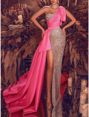 Mermaid / Trumpet Evening Gown Color Block Dress Wedding Guest Prom Court Train Sleeveless One Shoulder Detachable Satin with Sequin Slit