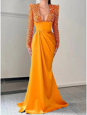 Mermaid / Trumpet Evening Gown Elegant Dress Formal Sweep / Brush Train Long Sleeve V Neck Satin with Pleats Sequin
