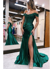 Mermaid / Trumpet Evening Gown Empire Dress Formal Court Train Sleeveless Off Shoulder Imitation Silk with Slit Appliques - Emerald Green / US 2 / UK 6 / EU 32