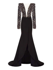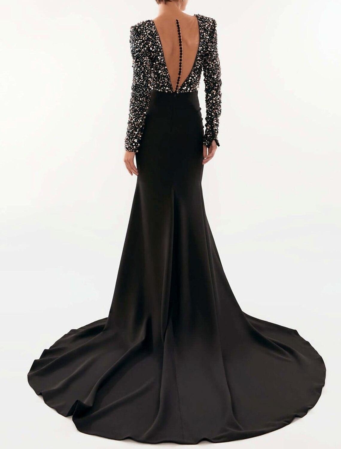 Mermaid / Trumpet Evening Gown Reformation Amante Dress Wedding Guest Court Train Long Sleeve Illusion Neck Satin with Sequin Slit Splicing - US 2 / UK 6 / EU 32