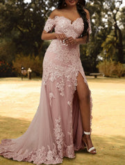 Sheath / Column Prom Dresses Luxurious Dress Formal Wedding Guest Court Train Short Sleeve Off Shoulder Lace with Pleats Slit