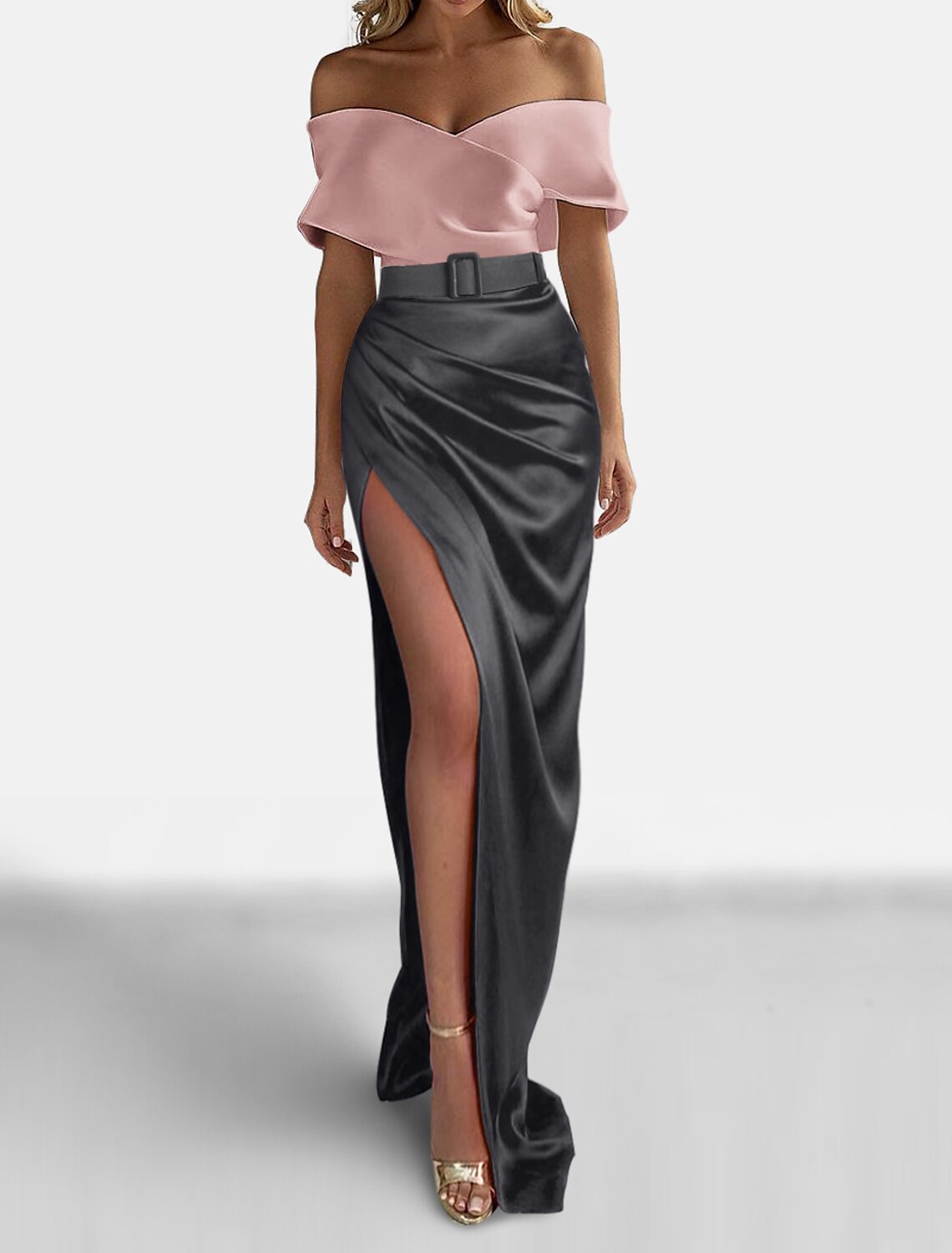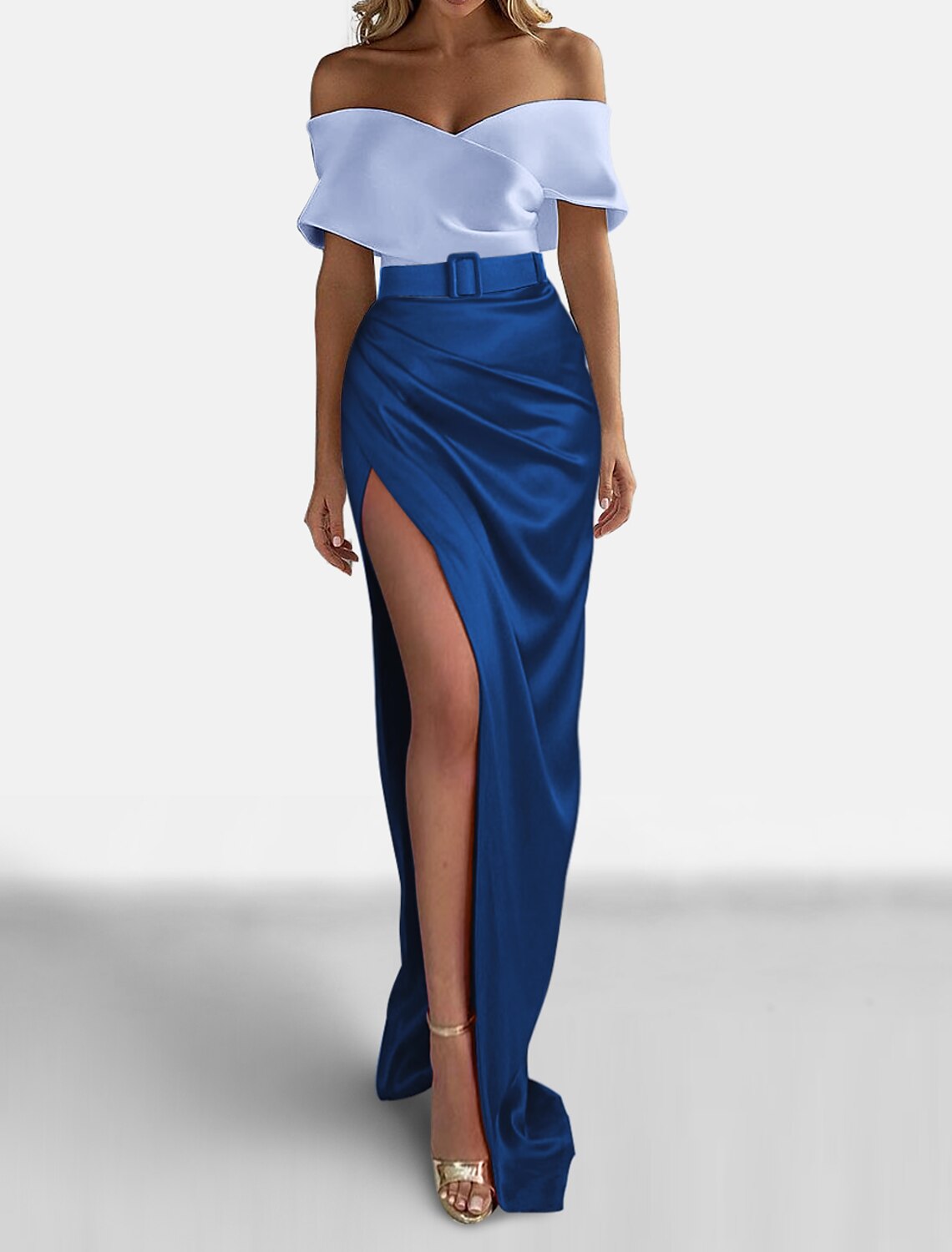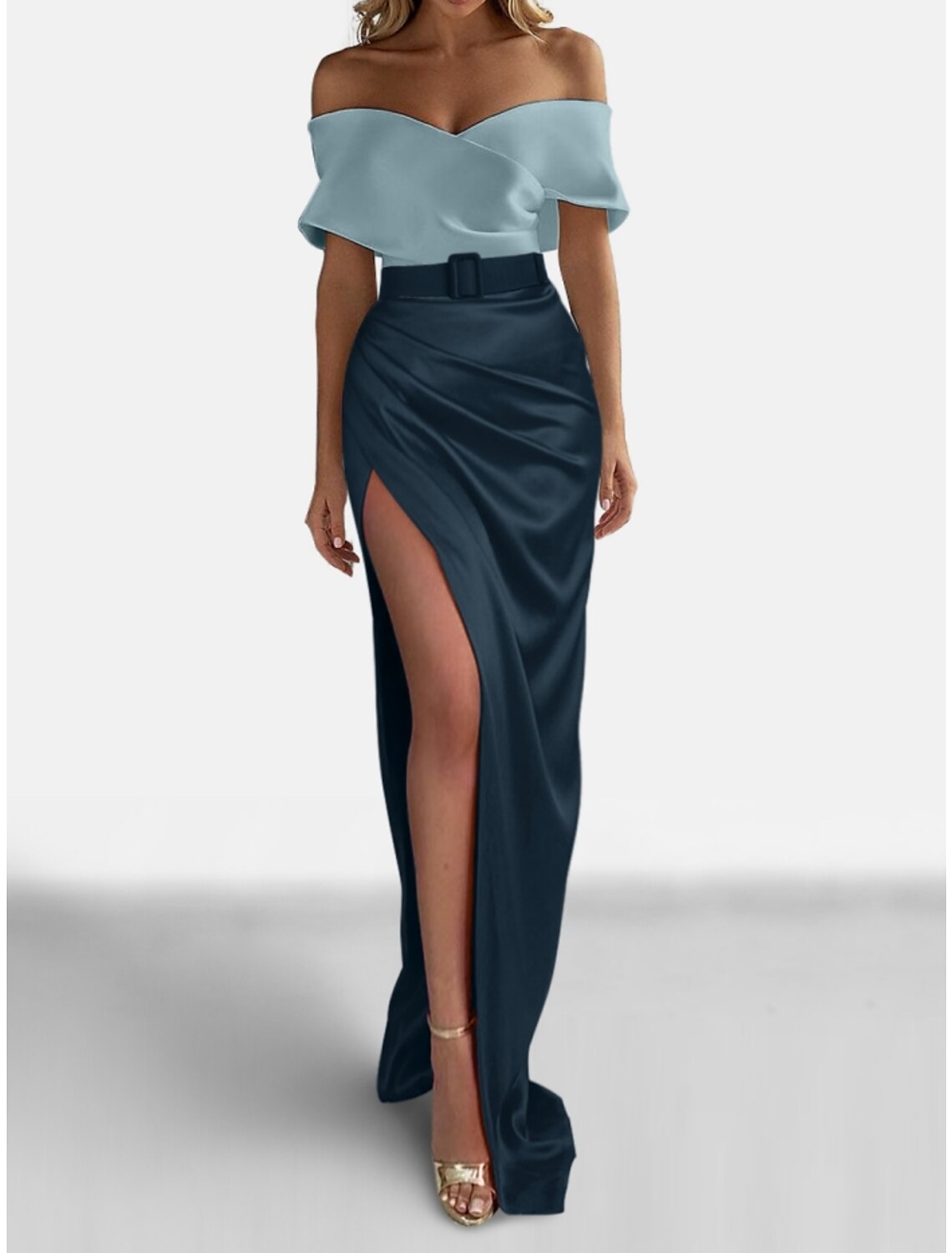 Sheath Evening Gown Elegant Dress Formal Sweep / Brush Train Red Green Dress Short Sleeve Off Shoulder Satin with Ruched Slit